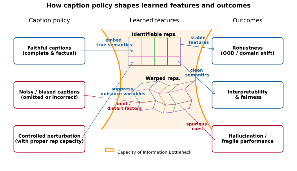 确保描述忠实性以覆盖关键语义:大规模预训练中出现幻觉,往往是因为模型推断出了描述文本遗漏或扭曲的语义,导致关键语义缺失。基础模型优先考虑泛化与复用,因此忠实描述至关重要。当描述覆盖足够全面时,测试案例基本能保持分布内状态;否则模型将嵌入非事实或噪声信号,引发不可辨识性及下游幻觉。在大规模对比预训练中,语义缺失/扰动⇒不可辨识性(未获忠实描述的组件语义)⇒幻觉风险;可针对性剔除干扰因子。