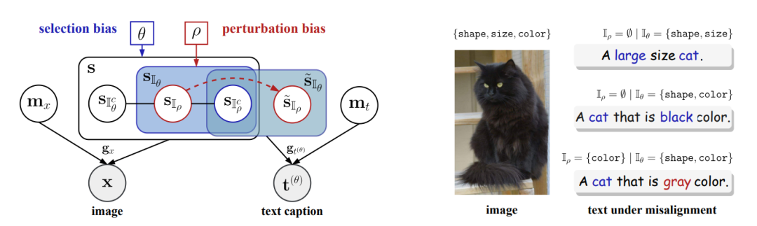 我们通过建模跨模态共享的潜在语义变量和特征的噪声形式来描述图像文本对的潜在生成过程 (data-generating process)。描述文本不对齐存在两种偏差模式:选择偏差(描述文本遗漏因子)与扰动偏差(描述文本随机错误描述因子)。