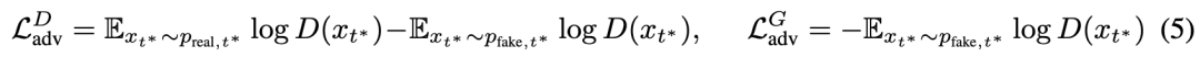 本文使用一个对抗目标,其中代理学生 充当特征提取器以获取判别器特征。这使我们能够在流潜在空间上进行对抗训练,而不是在中的图像空间。为了使用 提取特征,我们将样本 加噪到时间步 上预定义的噪声水平,并从 的多个层提取中间输出作为特征图。时间步 在 区间内均匀分布,以捕获粗粒度特征()和细粒度特征()。在这些特征之上训练 MLP 判别器头 进行真/假预测,其中由教师模型生成的合成样本被用作“真实”数据。与 NitroFusion类似,通过重新初始化判别器头的权重来定期刷新它们,以减少过拟合。我们使用标准的非饱和 GAN 目标来训练判别器头和生成器 :