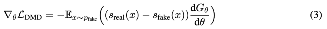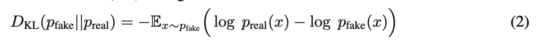 分布匹配蒸馏。DMD(Yin等人,2024b)提出通过将学生分布 与教师分布 进行匹配,来将一个多步教师模型 蒸馏成一个蒸馏后的单步学生模型 。给定一个样本 ,其中 ,这种分布匹配被计算为库尔巴克-莱布勒散度(KL散度):