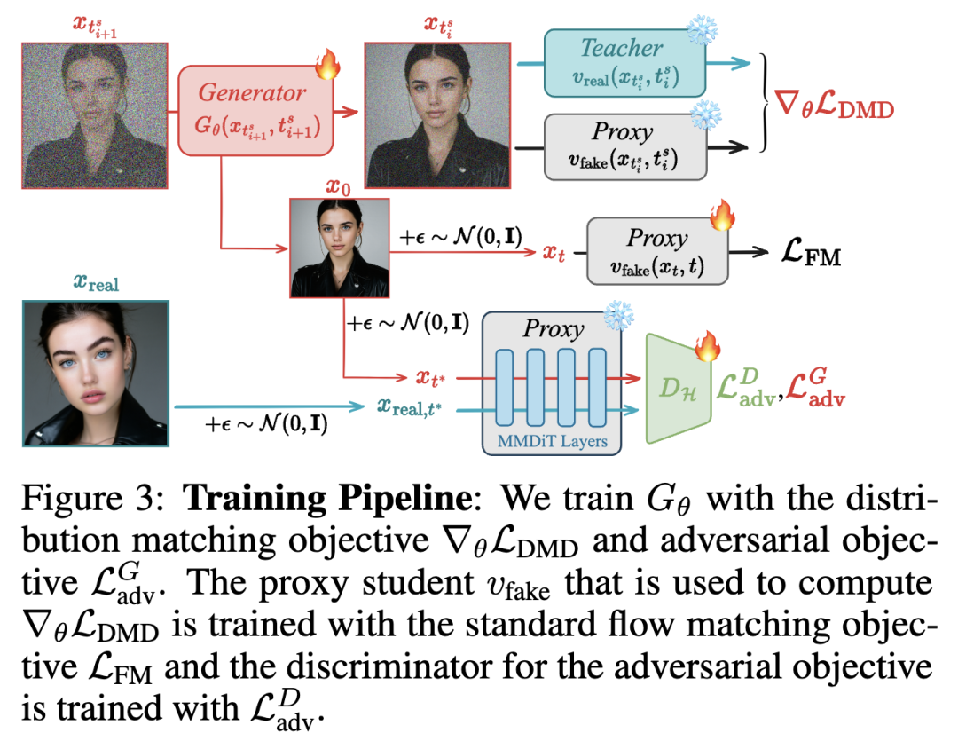 本文使用公式(3)中的 DMD 目标来微调我们预训练的学生模型,该目标通过代理()计算教师和学生分布之间 KL 散度的梯度。为了使代理和学生的分布对齐,从而通过在对生成的学生样本 进行微调来实现 LDMD 中学生分布的准确表示,我们对生成的学生样本 进行微调。具体来说,将终点估计值 加噪至 ,并计算流匹配损失为 ,其中 来自所添加的噪声。为了在时间步 ()训练学生模型 ,我们禁用梯度并使用学生模型本身生成直到 的结果。与 Yin 等人(2024a)不同,我们发现,对于时间步 ,直接在稍微嘈杂的样本 上开始训练,相比在样本 上训练,能提高性能。在训练稳定后,我们切换回在 上训练时间步 ,类似于 Yin 等人提出的“后向模拟”。