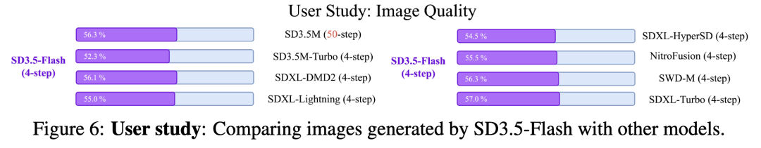 基于图像质量和提示词对齐进行了一项用户研究,共有124名标注者参与评估使用4个不同种子生成的图像。为了生成样本,我们使用了一个包含507个提示词的多样化精选集,这些提示词由专家设计的提示词和Parti提示词的一个子集组成。对于每个生成的样本,3名用户对来自两种不同方法的两张图像进行投票,从视觉质量和图像-提示词相关性(提示词遵循度)两个方面对它们进行评分。从用户研究(下图6)中,SD3.5-Flash在图像质量上优于其他少步模型,甚至优于50步的教师模型。在提示词遵循度方面,所有方法之间的差异很小(< ±1.6%)。