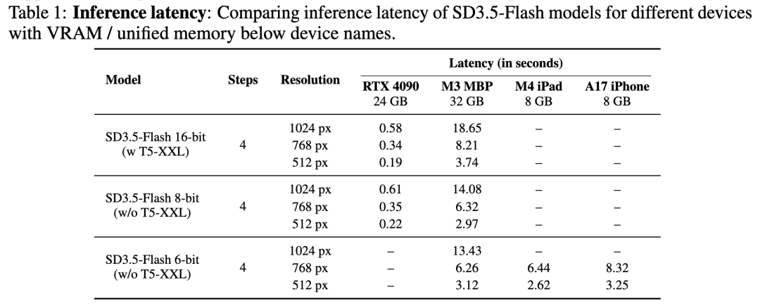 在 Stable Diffusion 3.5 pipeline 之上执行推理优化。该 pipeline 除了 MM-DiT 扩散模型和 VAE之外,还包括三个文本编码器(CLIP-L、CLIP-G和 T5-XXL)。其中,T5-XXL 是最大的组件,占用了峰值 VRAM 使用量和推理时间的大部分。完整的 16 位精度蒸馏模型需要 18 GiB 的 GPU 内存——这超出了大多数消费级显卡的能力范围。为了降低需求,我们将 MM-DiT 扩散模型量化为 8 位,并利用 SD3.5 中的编码器丢弃预训练来用空嵌入替换 T5-XXL。这将我们的内存需求降低到仅约 8 GiB。为了真正支持手机和平板电脑等边缘设备,我们使用 Apple Silicon 上的 CoreML 将我们的 8 位模型进一步量化为 6 位(下图2)。专门针对此量化,我们重写了 RMSNorm 等操作,以在 Apple Neural Engine 上更好地保持精度。在下表1中总结了我们的优化结果,并强调了在 iPhone(补充压缩包中的视频)和 iPad 等设备上低于 10 秒的延迟。我们在下图8中包含了关于内存性能权衡的更多细节。