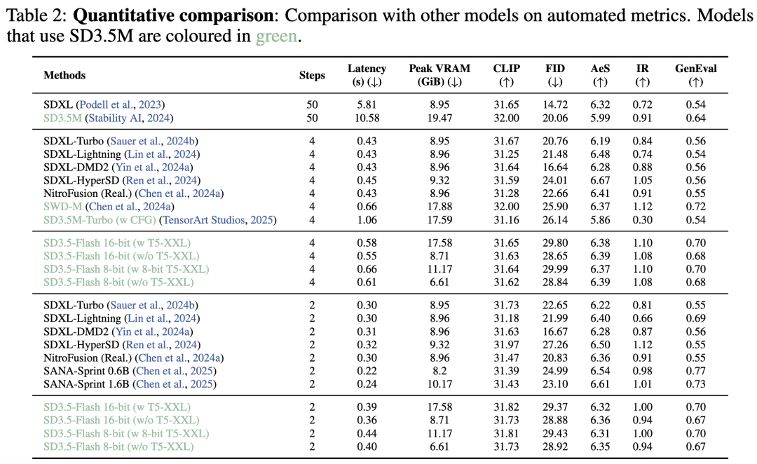基线。为了进行比较,本文考察了以 SDXL作为教师网络训练的 DMD2、Hyper-SD、SDXL-Turbo、Nitrofusion和 SDXL-Lightning。DMD2 通过匹配教师和学生的分布与 KL 散度目标的梯度来蒸馏 SDXL。Hyper-SD 通过轨迹引导执行一致性蒸馏,并使用人类反馈学习来提高性能。SDXL-Turbo 在 Dino-V2的丰富语义空间中展示了对抗蒸馏,在整个训练过程中将潜在变量解码为图像。SDXL-Lightning 也使用对抗蒸馏,但通过在判别器中混合使用条件目标和无条件目标来放宽对学生的模式覆盖要求。Nitrofusion 通过多判别器设置和周期性判别器刷新来稳定对抗蒸馏,并在 SDXL-DMD2 和 SDXL-HyperSD 上进行训练。相较于 SDXL 和 SDv2.1,最近的模型如 SD3.5和 SANA通过采用整流流 pipeline 以实现更快收敛,提供了更好的生成质量和更高的提示遵循度。SWD通过训练一个尺度感知网络来蒸馏 SD3.5M,并使用分布匹配目标进行优化。SANA-Sprint使用连续时间一致性蒸馏将 SANA 蒸馏到 1、2 和 4 步模型。我们还包括与 TensorArt Studios发布的 SD3.5M-Turbo 的比较,它是基于 SD3.5M 的一个独立检查点。我们不与难以装入消费级硬件的大型模型(如 SD3.5 Large (8B) 和 Flux.1-dev(12B))进行比较。