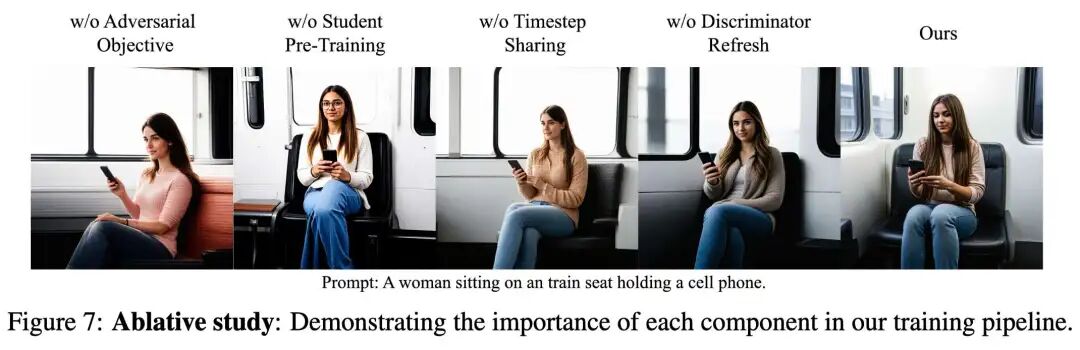 通过在我们的流程中逐个移除组件来蒸馏 SD3.5M(16 位 4 步)进行消融实验(下图 7),展示了它们对生成保真度的重要性。具体来说,我们蒸馏了以下模型:(i)无对抗目标:不使用 GAN 训练来指导生成,(ii)无预训练:不预训练学生生成器 ,(iii)无时间步共享:在 LDMD 中对 使用随机时间步 而不是学生轨迹上的时间步,以及(iv)无判别器刷新:不定期重新初始化判别器头以纠正过拟合。我们使用与学生模型相同的迭代次数训练消融模型。我们发现移除对抗目标会使训练不稳定,导致生成质量差。没有预训练时,颜色和构图受影响最大。没有时间步共享的训练也会导致纹理、颜色和构图差。最后,没有判别器刷新时,我们发现存在轻微的构图错误和图像过度平滑。