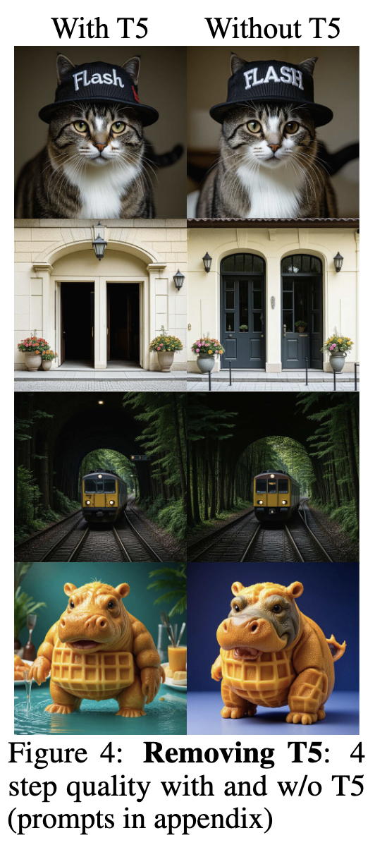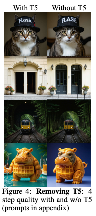 与所有蒸馏过程一样,在复杂生成任务中,我们以推理速度为代价,在质量和多样性的某些方面进行了权衡。我们发现,为了更快的推理和更低的内存而移除 T5,也会因条件上下文变差而难以构建复杂的构图(下图 4)。然而,这些限制并非我们方法所独有,而是用低步数模型近似扩散轨迹的自然结果。尽管如此,我们发现我们的 4 步模型相比教师模型实现了高达约 18 倍的加速,并在包含不同复杂度提示词的大规模用户研究中,其平均性能超过了教师模型。