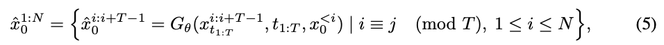 为了解决这个问题,我们不是对每个窗口进行反向传播(这需要每次前向传播的梯度),而是采样一部分不重叠的窗口来构建预测的干净视频,如上图 3 所示。梯度计算仅在这些选定的窗口上进行,这显著减少了内存使用,同时保留了有效的监督。形式上,预测的干净视频给出如下:
