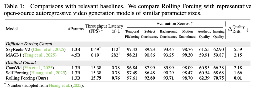 我们将滚动强制与几个相关的、规模相当的开源视频生成模型进行比较。具体来说,SkyReels-V2(Chen 等,2025)在扩散强制范式下进行训练,该范式在推理过程中破坏历史帧以减轻误差累积。MAGI-1 在训练和推理中均采用 FIFO 式去噪范式。我们还与先前的基于蒸馏的方法进行比较,包括 CausVid 和自我强制。需要注意的是,SkyReelsV2、CausVid、自我强制和我们的滚动强制均从相同的基础模型 Wan2.1-T2V-1.3B 初始化。
