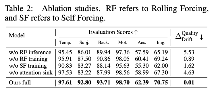 滚动扩散窗口。 评估了两个变体:无 RF 推理(w/o RF inference)和无 RF 训练(w/o RF training)。在无 RF 推理中,移除了滚动去噪窗口,并在推理过程中采用逐帧去噪,同时保持与我们完整方法相同的训练过程和模型权重。在无 RF 训练中,模型完全在逐帧范式下进行训练和推理。如下图 5 所示,这两个变体在 30 秒内都遭遇了明显的误差累积,表明滚动窗口对于抑制长期漂移至关重要。