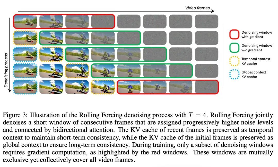 Rolling Forcing,这是一种用于实时长时视频生成的框架,能够在维持亚秒级延迟的同时减轻误差累积。通过引入滚动窗口联合去噪策略,Rolling Forcing 使得连续帧之间能够进行相互优化,有效减少长期漂移。注意力汇机制的整合进一步通过将初始帧作为持久上下文锚定来增强全局一致性,而我们高效的训练算法则在扩展的去噪窗口上实现了少步蒸馏,同时减轻了曝光偏差。大量实验表明,Rolling Forcing 在长达数分钟流序列中实现了最先进的时间一致性和视觉保真度,在质量和效率上显著优于先前的流媒体方法。