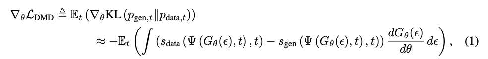 然而,第二种蒸馏方法提供了一种绕过去噪损失并减轻曝光偏差的途径。CausVid(Yin et al., 2025)将预训练的双向模型蒸馏为少步因果模型。它采用了一种分布匹配蒸馏(Distribution Matching Distillation, DMD)损失(Yin et al., 2024b),该损失最小化在随机采样的时间步 上平滑数据分布 与学生生成器的输出分布 之间的反向KL散度。反向KL的梯度可以近似为两个得分函数之间的差异: