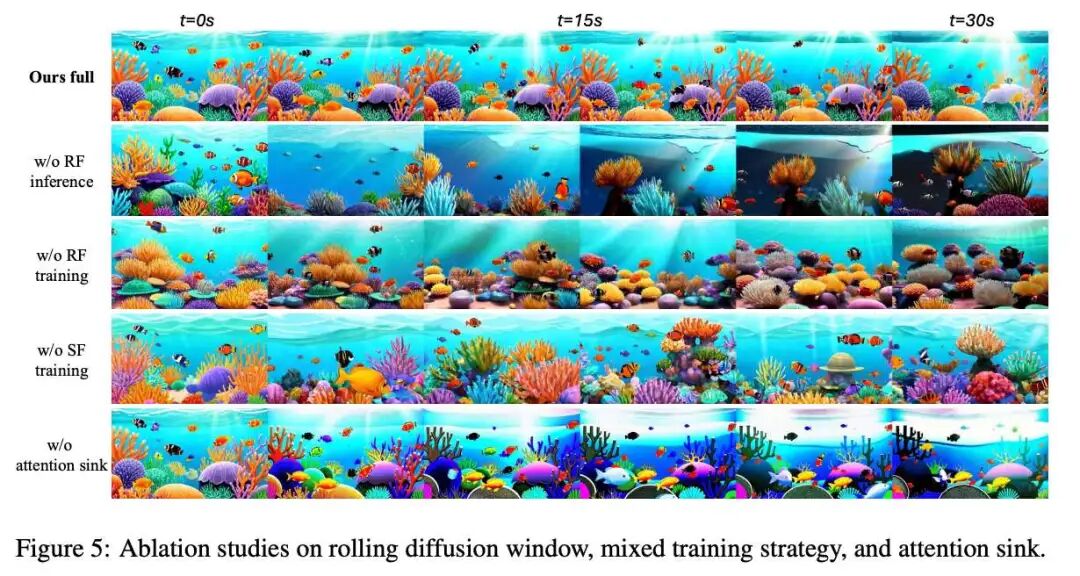注意力陷阱。 最后,移除全局上下文帧(w/o attention sink)导致生成视频中出现明显的漂移,如上图 5 所示。