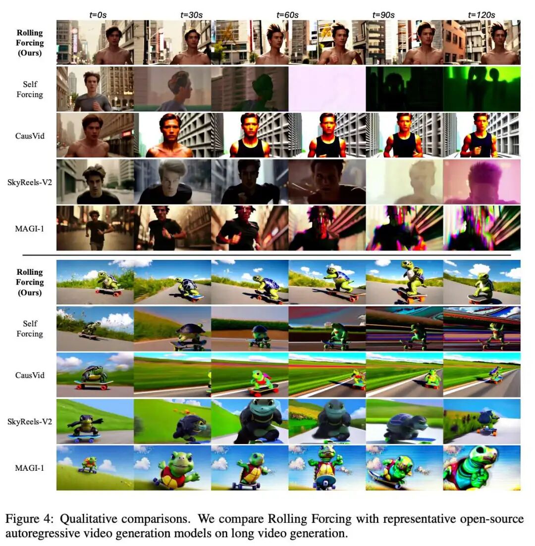 图 1:Rolling Forcing 可在单个 GPU 上以 16 fps 的速度实时生成从文本到视频的流媒体,并能以最小的误差累积生成长达数分钟的视频。