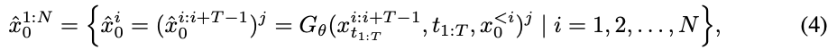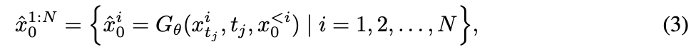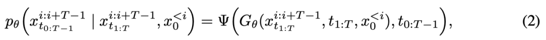其中, 表示去噪窗口中的噪声帧, 表示窗口输出,其中每个帧都去噪到较低的噪声水平。生成器 在输入噪声帧、它们的噪声级别 和干净的历史帧 的条件下预测干净帧。 在噪声级别 上向预测的干净帧注入高斯噪声 ,生成噪声水平降低的帧。