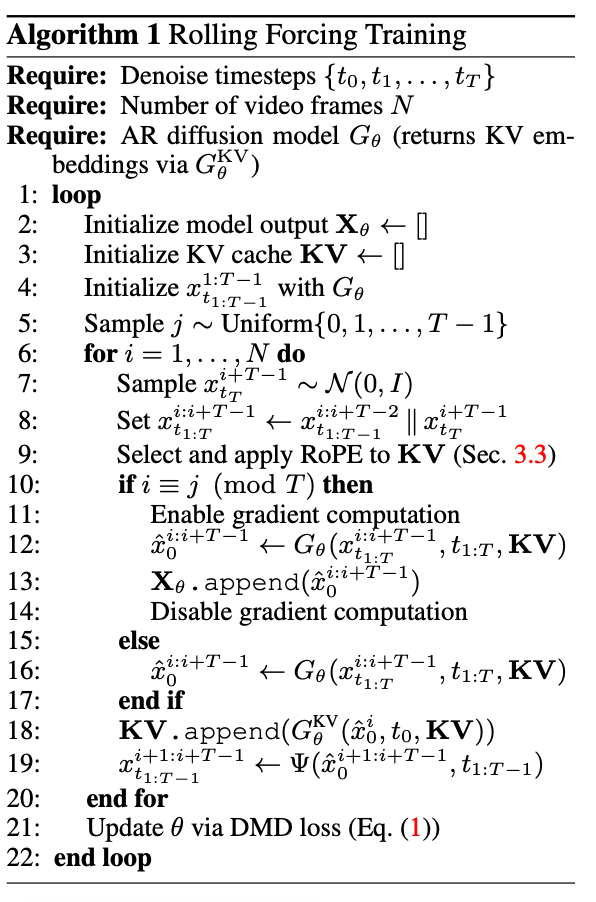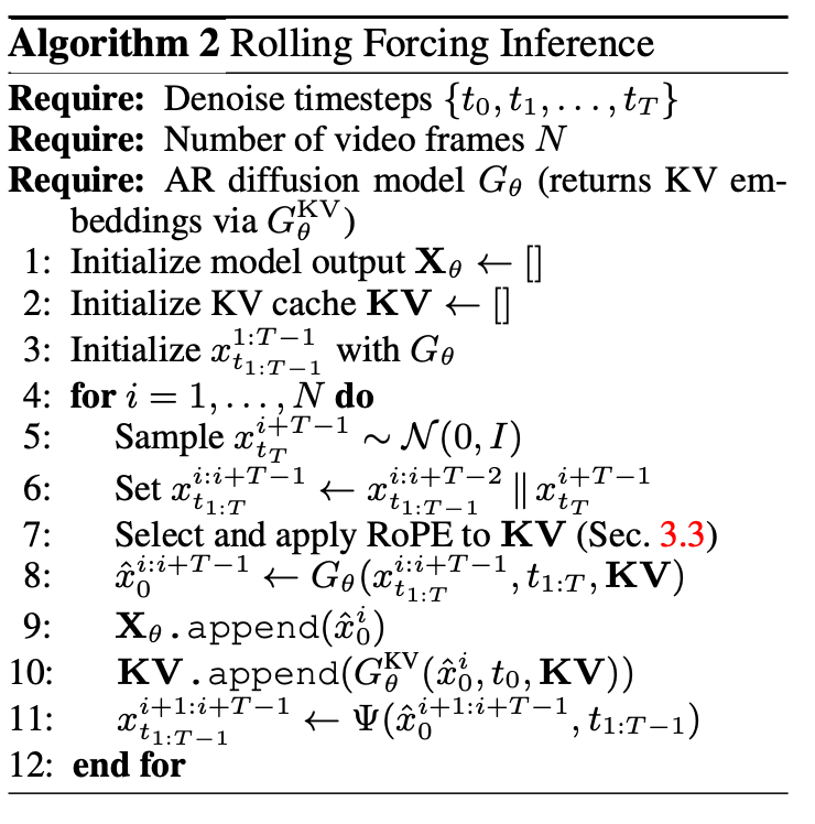与自我强制(SF)类似,训练期间的输入噪声帧 是由模型生成的,而不是取自真实数据,从而减轻了曝光偏差。然而,与公式 (3) 或公式 (4) 不同的是,公式 (5) 中的每个帧在预测的干净视频 中是从不同的噪声水平 去噪的。因此,从不同噪声水平去噪的帧具有不同的质量和清晰度,导致在 DMD 训练中产生不自然的视频 和相机运动。为了解决这个问题,我们采用了一种混合训练策略,在自我强制训练(公式 (3))和滚动强制训练(公式 (5))之间以相等的概率交替进行。自我强制目标作为正则化器,鼓励模型生成具有自然相机运动的视频。在推理中,仅采用滚动强制范式,如算法 2 中详细说明的那样。