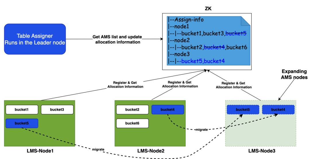 LakeKeeper 通过 ZK 协调服务实现分桶的动态分配与故障转移,确保系统在节点上下线时仍能稳定运行,核心流程如下: