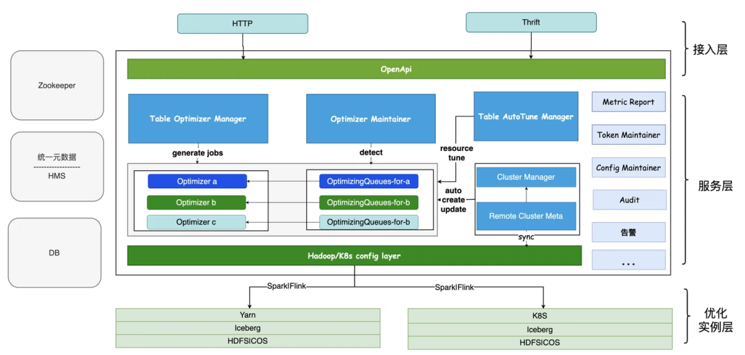 LakeKeeper 采用分层架构设计,包含接入层、服务层、优化层三大模块,核心组件及功能如下: