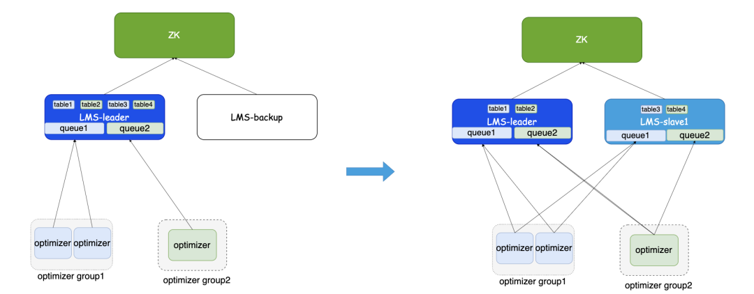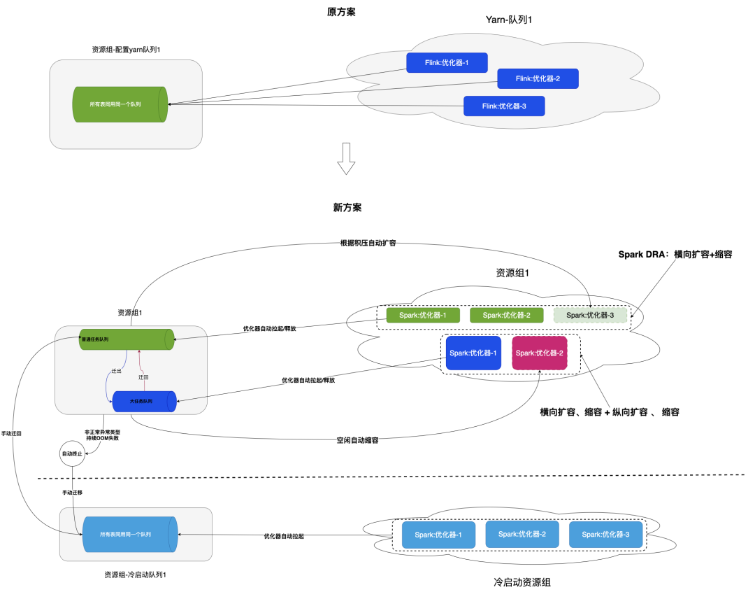 基于此一个资源组对应一个队列,改成一个资源组对应一个普通队列和一个用于处理大任务的队列, 如果普通队列中的表出现OOM失败后,则自动迁移到大任务队列,大任务队列中有表处于Pending状态后,自动触发启动资源组对应的优化器进行处理。表被迁移到大任务队列后,经过多轮成功的优化任务后自动迁移回普通队列。此外,还需要实现根据队列积压状态对优化器实现自动扩缩容能力。