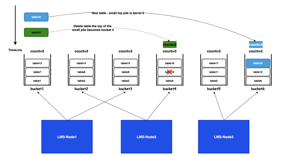 每个从节点(LMS-Backup)负责处理一个或多个指定的桶,例如 10 个从节点,每个节点负责 100 个桶;从节点仅需关注所属桶内的表,实现职责分离,避免跨节点元数据访问。