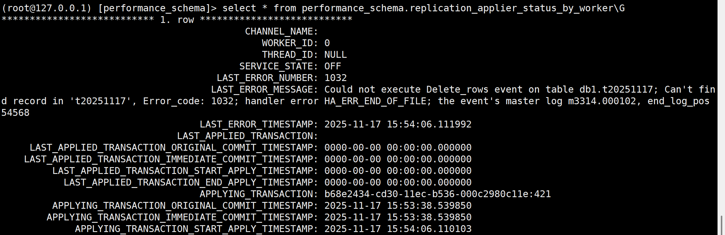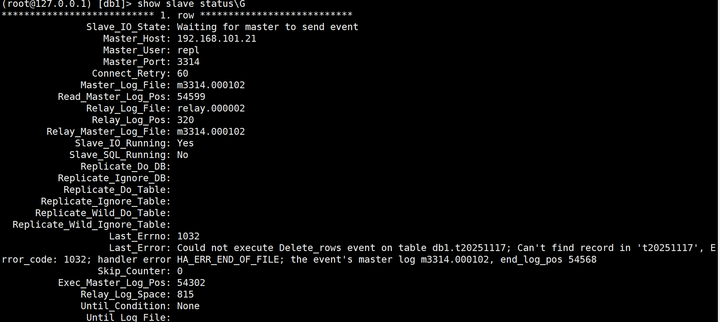 再一次把路堵死了. 我们看下报错时间,发现是2025.11.dd hh:mm:ss, 之前数据一直是同步的, 而且延迟为0, 也就是说这一刻附近做了啥骚操作,导致主从数据不一致的; 查看下history,发现该时间点存在一个登录操作. 难道这就是内鬼? 咨询业务发现在该时间存在数据导入操作.
