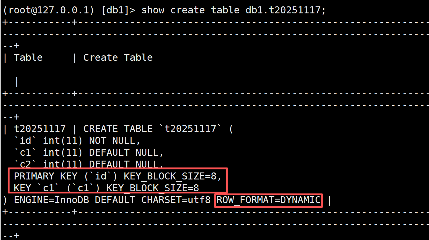 create table db1.t20251117(id int primary key, c1 int, c2 int, key(c1))row_format=dynamic;