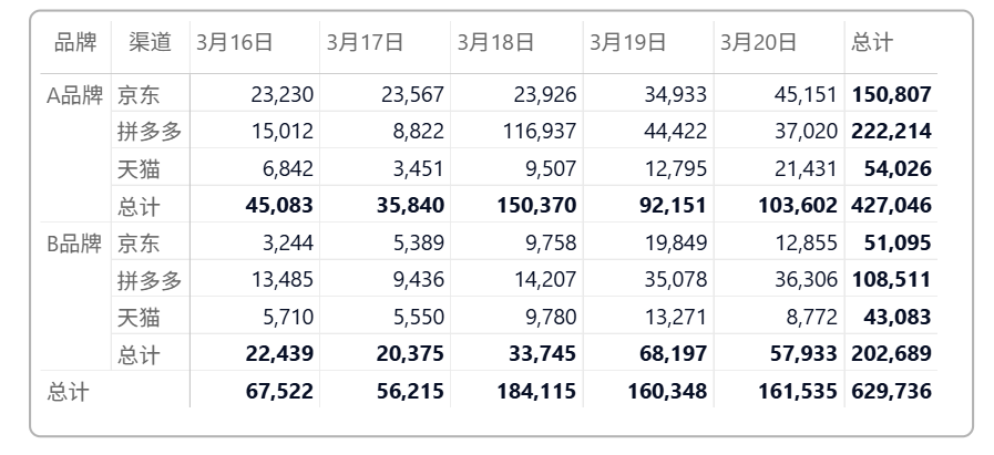 Power BI矩阵和Excel透视表类似,当有双层维度时,整体总计无法分栏。例如下表中无法看到品牌汇总的各渠道业绩: