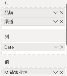 渠道是一个维度,现在需要将维度转换为度量值,行变为只有品牌,值变为各渠道分拆的度量值: