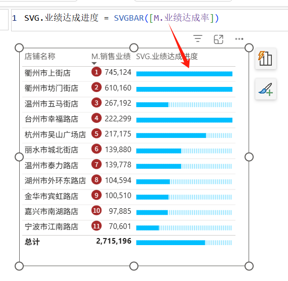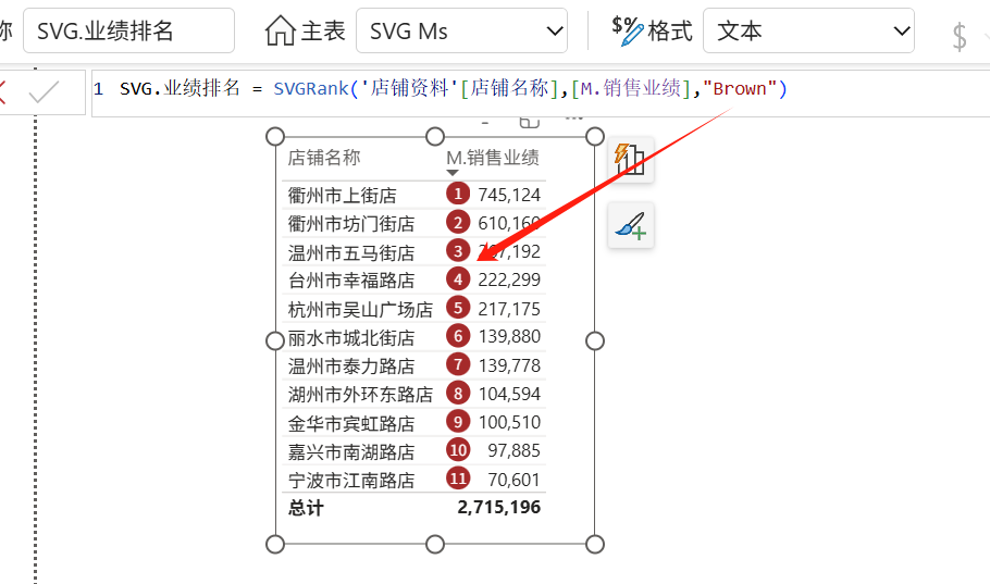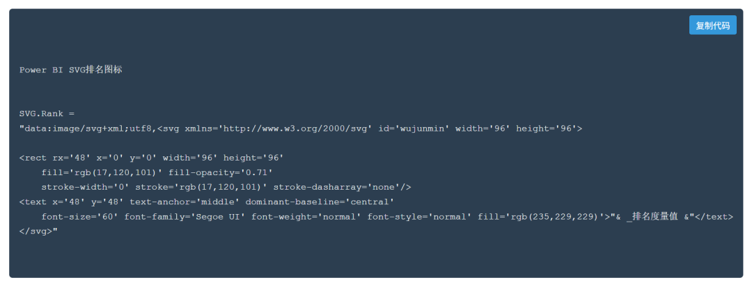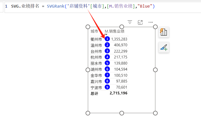 例如下图,我封装了一个SVG排名图标函数SVGRank,用户在度量值输入三个参数-对什么维度进行排名,依据什么指标,显示什么颜色,即可实现下图的效果。