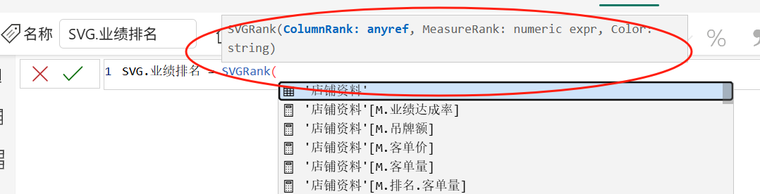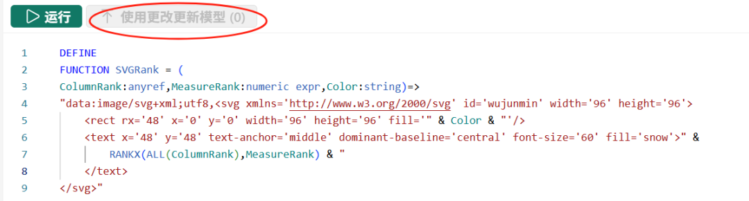该函数定义了三个参数,维度、指标、颜色,并在SVG代码中引用这三个参数。添加完成后点击下图红框处函数生效。