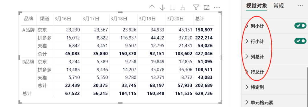 2. 总计行按二级维度分栏,解决汇总只显示一行,看不到明细(本例为销售渠道小计)的问题
