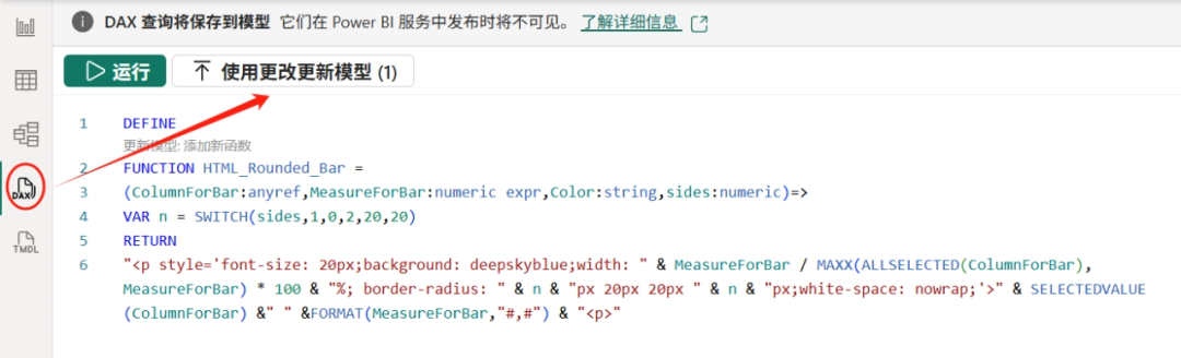 切换到DAX查询视图,粘贴代码,点击右上角的使用更改更新模型即生效。