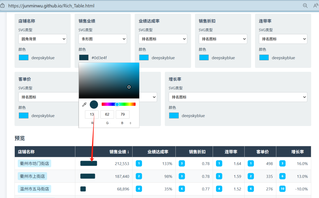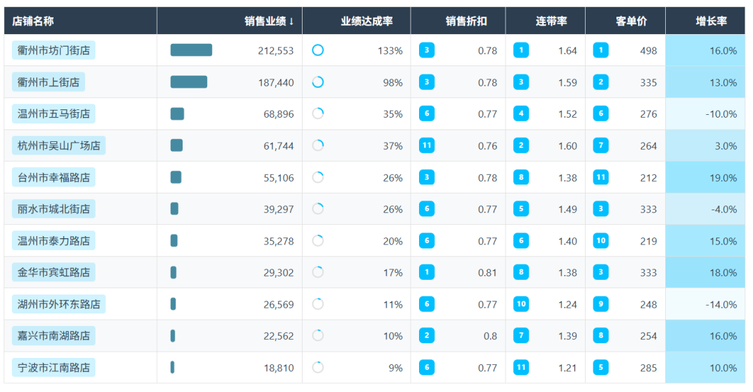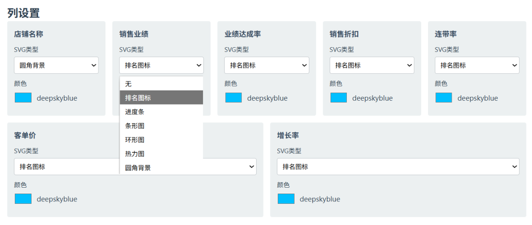 排名图标是默认效果,每列的迷你图样式可以切换,目前内置了条形图、进度条、环形图、热力图和圆角背景。