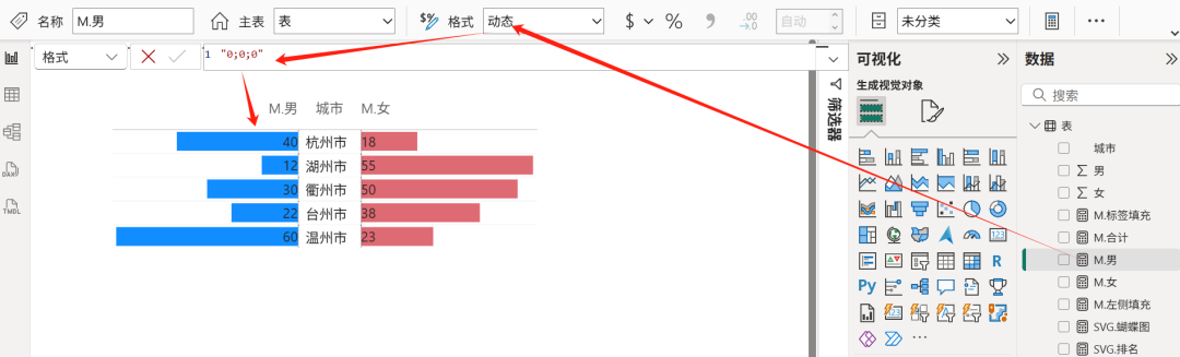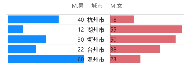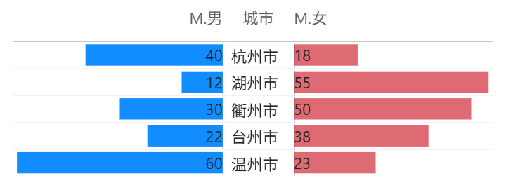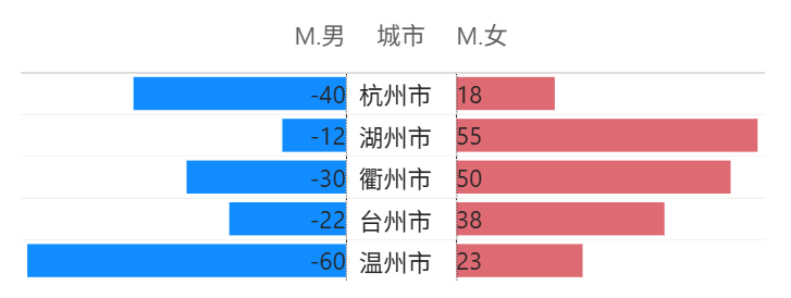 这不是想要的,需要将左侧的数据条从右向左显示。可以把左侧的指标乘以负1,但是数据条对了,数据标签却错了: