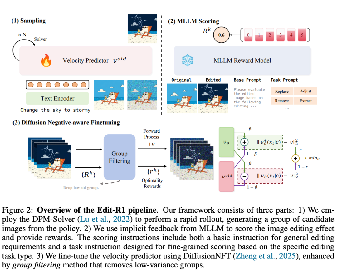 部分 1:采样 得益于策略优化与数据采样的解耦,DiffusionNFT 允许充分利用任何黑盒求解器进行采样。因此,本文特别采用 DPM-Solver,对给定的源图像和编辑指令进行快速展开,生成一组从旧策略 采样的 个图像 。
