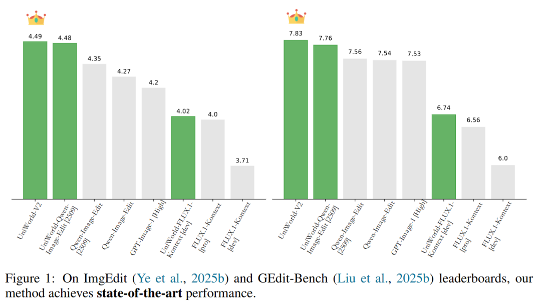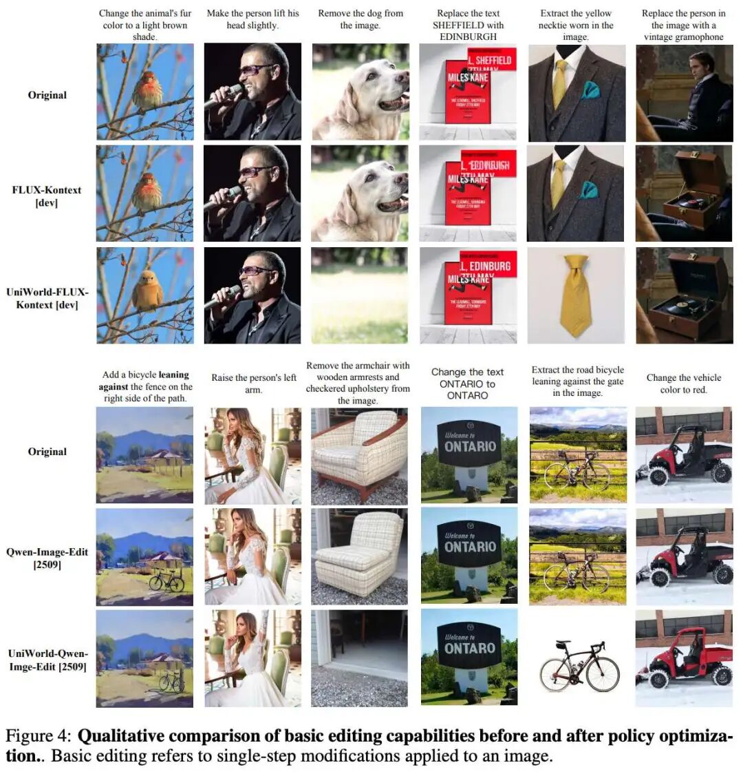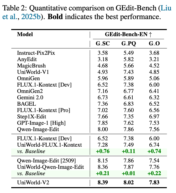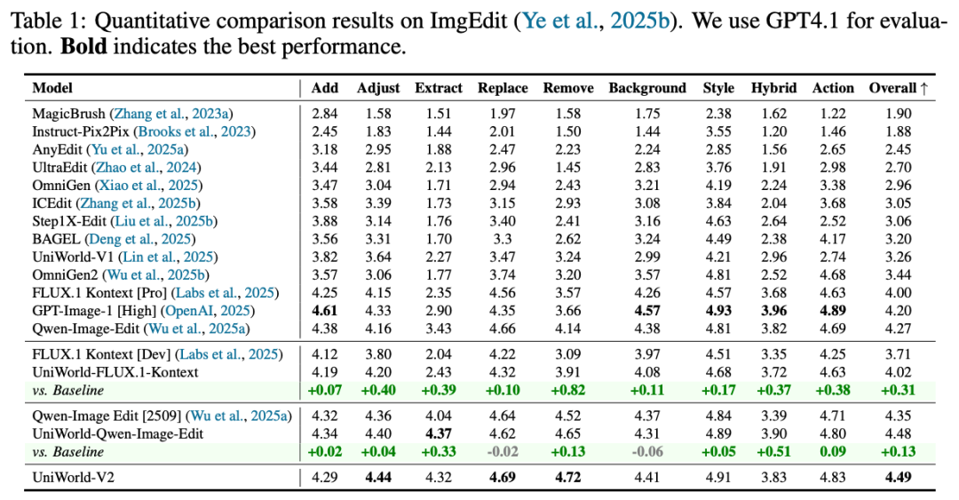 本文的方法释放了模型的潜力并显著提高了其性能。 如上表 1 所示,本文的方法显著增强了所有基础模型在 ImgEdit 基准上的表现。对于 FLUX.1-Kontext [Dev],整体分数显著提高,从 3.71 上升到 4.02,超过了较强的 Pro 版本(4.00)。同样,在应用于 Qwen-Image-Edit [2509] 时,本文的方法将其分数从 4.35 提升到令人印象深刻的 4.48,实现了开源模型中的最先进性能,并超越了顶级闭源模型如 GPT-Image-1。除了总得分的提升之外,UniWorld-FLUX.1-Kontext 在“调整”、“提取”和“移除”维度上表现出显著的性能提升,而 UniWorld-Qwen-Image-Edit则在“提取”和“混合”维度上表现优异。此外,UniWorld-V2达到了最佳性能。这一现象表明,本文的方法能够解锁和显著提高基础模型中之前未开发的潜力。