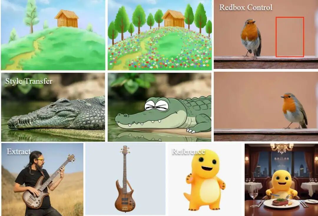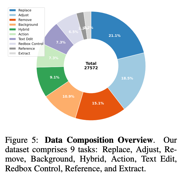 本文整理了一个包含 27,572 个基于指令的编辑样本的数据集,如下图5所示,这些样本来自 LAION、LexArt 和 UniWorldV1。为了增强任务多样性,加入了额外的文本编辑和红框控制任务,共形成九种不同的任务类型。利用在线学习模式,本文的方法仅依赖于原始图像及其相应的编辑指令,这消除了对高质量编辑结果图像的需求。对于 LAION 子集,使用 ImgEdit 提供的现有对象注释和边界框。预处理管道包括:1)过滤掉过小或过大的边界框;2)使用 Qwen2.5-VL-32B 模型评估编辑指令的合理性。对于文本编辑任务,基于 LexArt 子集随机更改单词中的字符以生成训练样本。在红框控制任务中,从处理后的 LAION 数据中提取一个子集,在目标对象周围画出红色边界框,并生成三种类型的编辑指令:调整、移除和替换。对于参考和提取任务,使用来自 UniWorld-V1 的高质量试穿数据。由于该数据集的多样性有限,本文仅为这两个任务使用 600 个样本。