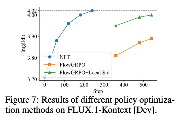 部分 3:DiffusionNFT 通过群体计算,原始 MLLM 分数 被转换为最优性奖励 。这些奖励随后用于使用 DiffusionNFT 目标(在公式 4 中定义)更新策略模型 。该过程引导模型的速度预测器朝向高奖励结果,同时远离低奖励结果,有效地微调模型以更好地遵循用户指令并产生更高质量的编辑结果。