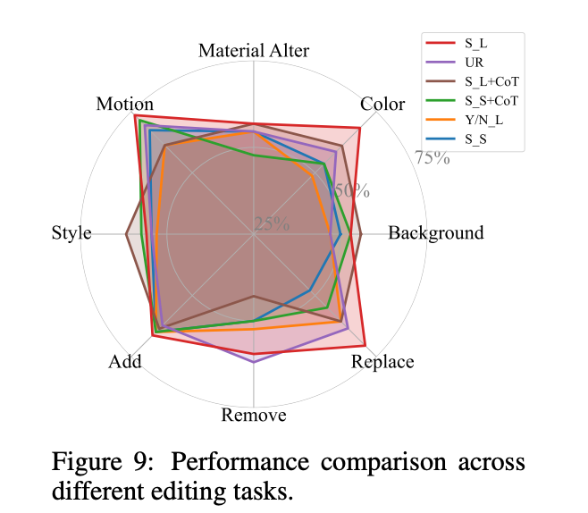 人类对齐。 为了验证本文的奖励机制选择,本文评估了不同评分方法与人工判断的对齐情况。结果表明,本文采用的基于 logits 的方法在所有评估的奖励机制中,与人类偏好的相关性最高。如下表4所示,该方法实现了 74.74% 的整体配对准确率,显著超越其他方法。此外,如下图9所示,优越的对齐在多样的编辑任务中是一致的。