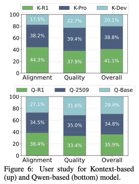 本文的方法在人工偏好评估中证明了其有效性。 为了全面评估,本文对 FLUX.1 和 Qwen系列进行了人工偏好研究,参与者将本文的微调模型与其基础模型和更强大的版本进行比较。他们被要求在两个维度上选择最佳结果:指令对齐和图像质量。如图6所示,用户在所有标准中更倾向于选择 UniWorld-FLUX.1-Kontext 而不是 FLUX.1-Kontext [Dev]。此外,它在编辑能力上表现出较强的优势,尤其是在与更强大的官方版本 FLUX.1-Kontext [Pro]的比较中。总体而言,UniWorld-FLUX.1-Kontext因其优越的指令遵循能力而获得更多的喜欢,尽管官方模型在图像质量上稍微胜出。这证实了本文的方法能够有效地引导模型生成更符合人类偏好的输出。