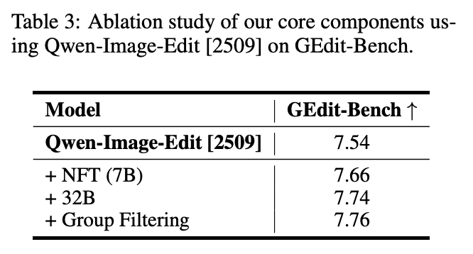 本文进行了消融研究以验证本文的核心组件。如下图7所示,本文在 FLUX.1 Kontext [Dev] 上采用 DiffusionNFT 作为策略优化方法。在 ImgEdit 基准测试中,它的表现优于包括 Flow-GRPO 及其使用局部标准差的变体在内的基线。此外,如下表3所示,将 DiffusionNFT 应用于 Qwen-Image-Edit [2509] 基线模型,其在 GEdit-Bench 上的得分显著从 7.54 提高到 7.72。引入组过滤机制后,得分进一步提升至 7.76。