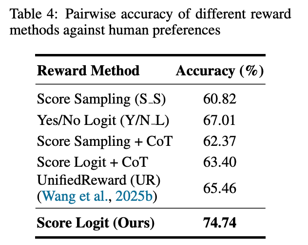 在 Edit-R1 中,本文使用非 CoT 和基于 logits 的评分方法,并设定 。此外,本文还对比了其他评分机制以验证其有效性,包括基于样本的方法和在评分前提示 MLLM 进行推理的 CoT 变体。另外,本文还参考了现有工作的预训练奖励模型进行基准测试。