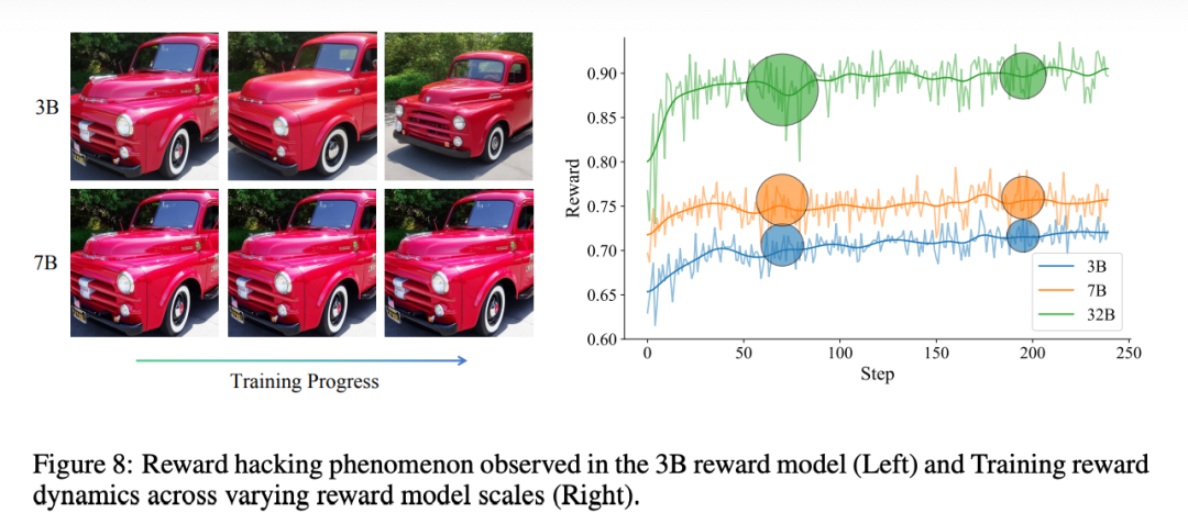 奖励 hacking 和奖励方差。 如下图8(左)所示,在 3B 模型上微调的策略模型表现出显著的奖励 hacking,其编辑结果偏离源图像。相比之下,在更大的 7B 模型上微调的模型缓解了这一问题。为了进一步调查,本文分析了训练奖励曲线,并将这一现象归因于奖励分数的方差。如下图8(右)所示,本文展示了平滑的奖励轨迹(实线)、原始奖励波动(阴影线)和奖励方差(气泡大小)作为探索强度的指示。