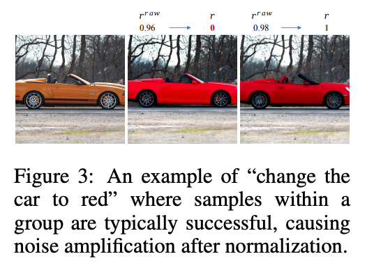 部分 2:MLLM 评分 根据 MLLM 的隐式反馈评估生成的图像组 ,以衡量其与编辑指令的契合度和整体图像质量。基于原始图像、编辑后的图像和评估提示,MLLM 为 生成一系列原始奖励分数 。为便于细粒度评分,评估提示结构化为两个部分:基础提示,概述基本的编辑要求和指令,以及任务提示,特别针对具体的编辑任务类型量身定制。