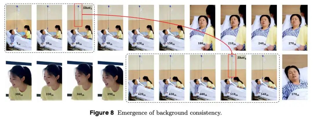 背景一致性的涌现。如下图 8 所示,展示了 MoGA 保持背景一致性的能力。在经过长的多镜头视频训练后,MoGA 展现出对环境与角色一致性的涌现性、隐性控制。即使没有明确指定细节(例如,橱柜形状和静脉输液瓶的位置),不同镜头也能自动保持连贯的、时间上一致的描绘。