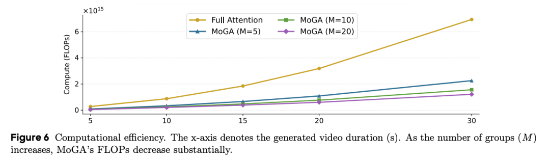 计算效率。下图 6 绘制了 Wan2.1-1.3B 模型的组数 () 与 FLOPs 的关系。实验表明,即使对于 30 秒视频使用相对较小的组数 (),MoGA 与完全注意力相比也实现了显著的计算节省(2.26 PFLOPs 对比 6.94 PFLOPs)。它还在训练和推理中实现了 1.7 倍的加速。值得注意的是,与诸如 VMoBA 这类因其基于块的机制而产生额外内存开销的其他稀疏注意力不同,我们的方法保持了内存效率,而没有额外的内存消耗。
