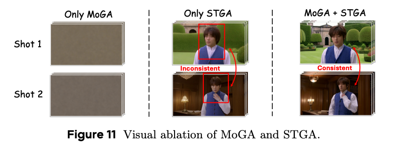 MoGA 与 STGA 的有效性。如下图 11 所示,MoGA 和 STGA 在实现上下文一致的长视频生成中扮演互补的角色。单独使用 MoGA 缺乏局部信息交换,无法生成有意义的视觉内容。相反,仅使用 STGA 限制了长程镜头交互,导致跨镜头一致性差和叙事连贯性减弱。当两者结合时,模型实现了强大的跨镜头一致性。这些结果表明,MoGA 以相对较低的计算成本有效地路由并保持了跨越镜头的身份和上下文。