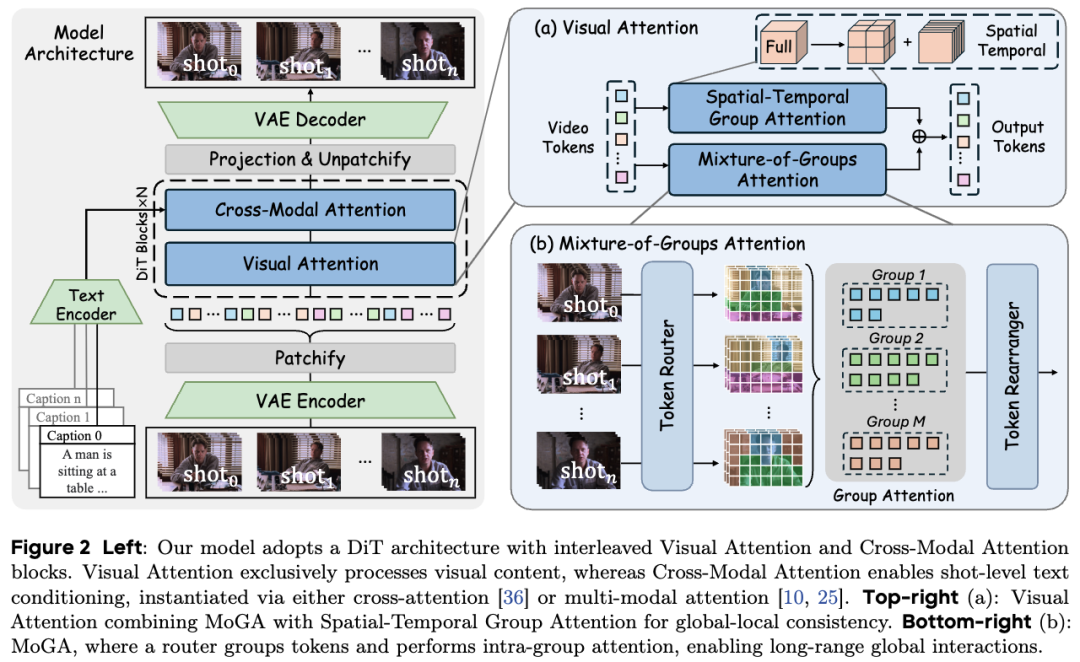 MoGA,一种稀疏注意力机制,它通过轻量级 token router,用精确的、学习得到的分组分配取代了粗粒度的块级评分。通过将 token 路由到连贯的组中,MoGA 提高了超长上下文下的注意力效率和保真度。基于 MoGA,我们提出了能够生成分钟级别、多镜头、480p 分辨率、24 fps 视频的生成模型。在视频生成中的多样实验进一步证明了我们方法的有效性。