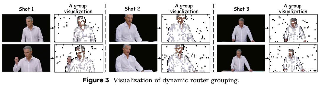 如下图3所示,在视频生成过程中从一个中间层的router提取分组分配情况,并可视化了一个代表性组。经过端到端训练后,router将人物的头部、手部和部分衣物分配到同一组,这表明其能够捕捉跨越镜头边界的语义连贯结构。
