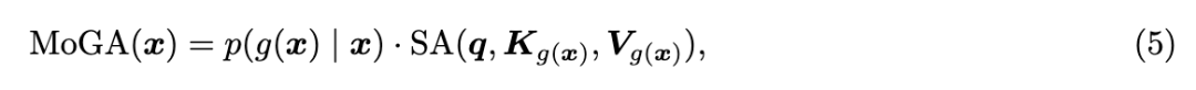 MoGA 通过高效的 token routing来解决上述挑战,其中一个轻量级、可训练的router将相关的 token 分配到各个组中,并在每个组内执行自注意力。该router是一个线性投影层后接一个 softmax 门控,类似于 MoE。给定一个token 和一个预定的组数量 ,router计算路由分数 的公式为: