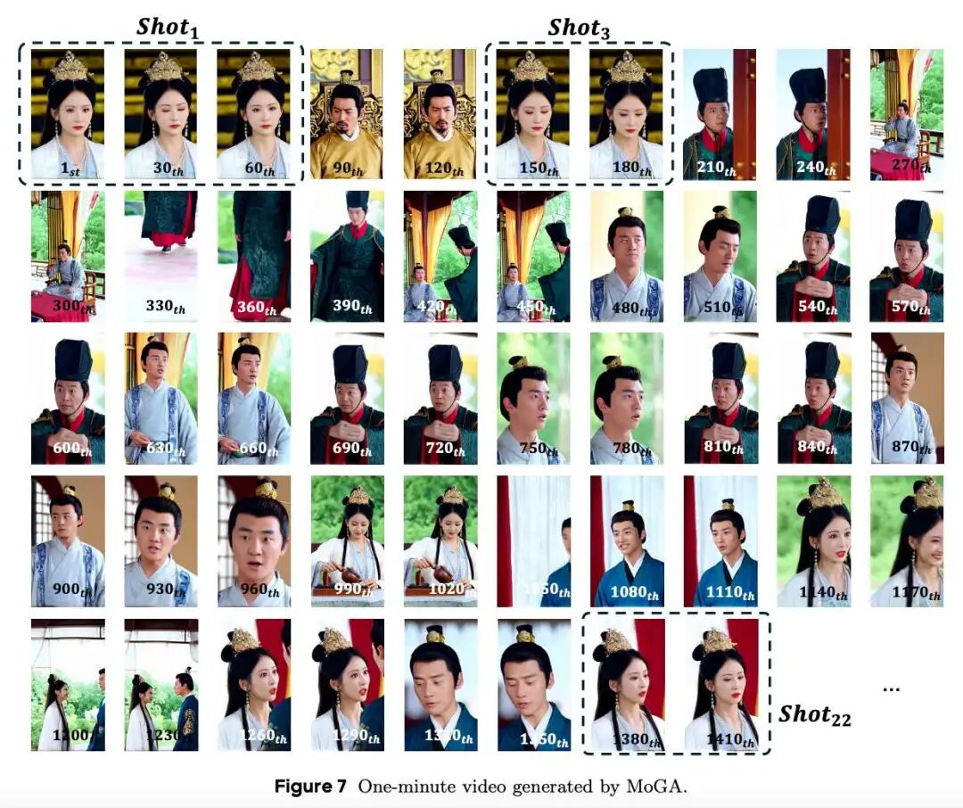 1,441 帧的一分钟视频。在下图 7 中,展示了基于 MMDiT 的 MoGA 模型()在超过一分钟的超长视频上的生成结果。MoGA 保持了强大的长程上下文一致性。第 1 个和第 22 个镜头保持高度连贯,并且女士的发夹和耳环等精细细节在镜头间得以保留。此外,即使有多个面孔出现在不同镜头中,模型也避免了身份混淆。